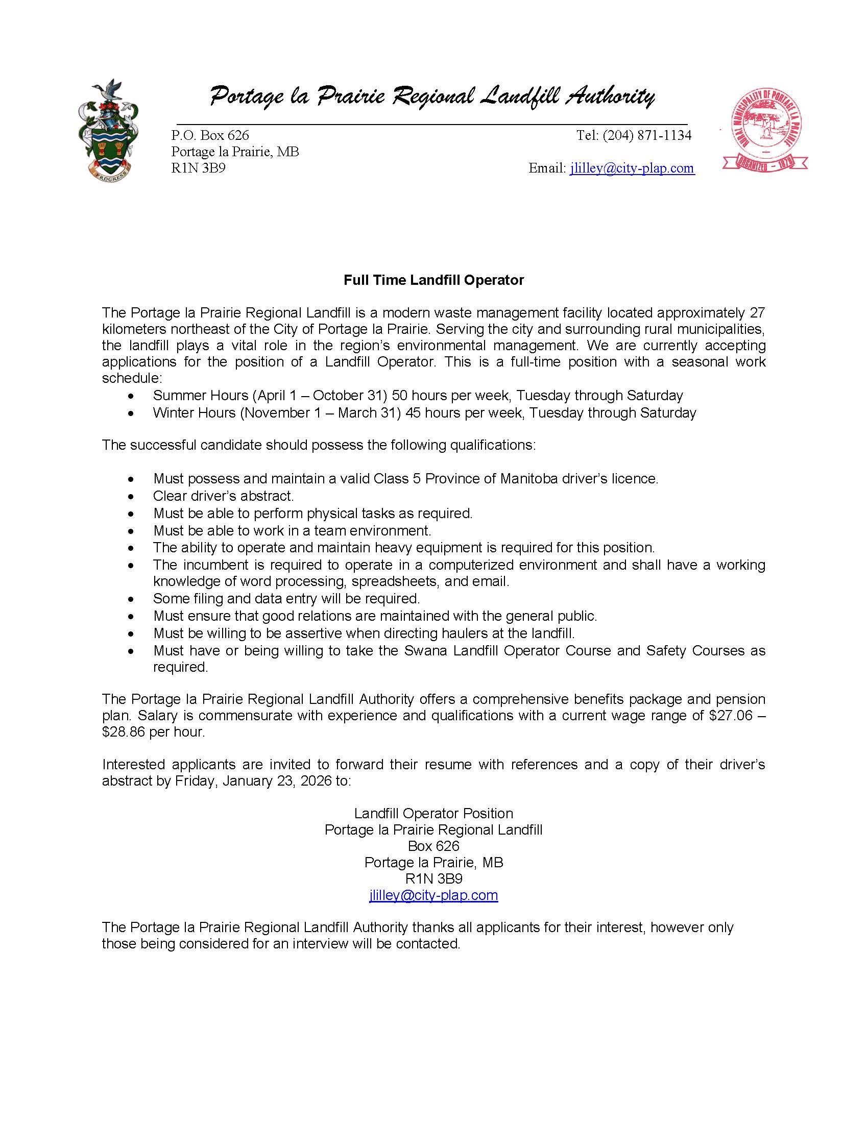 Landfill Operator - Portage Regional Landfill Authority